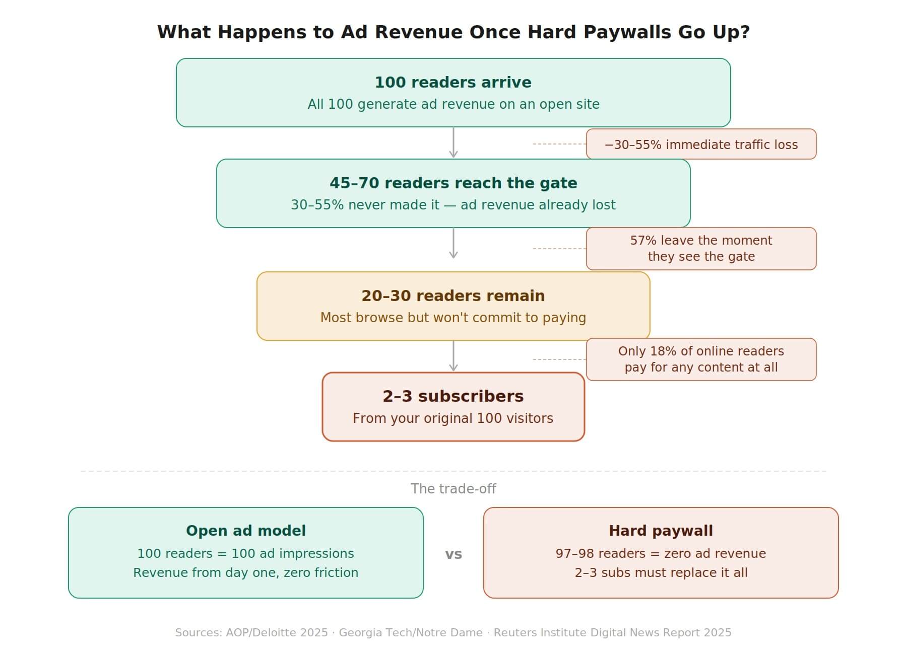 Overall, the brutal reality these statistics point to is that ad revenue can rarely be replaced by subscription revenue at the same scale, especially after traffic declines once the paywall goes live.