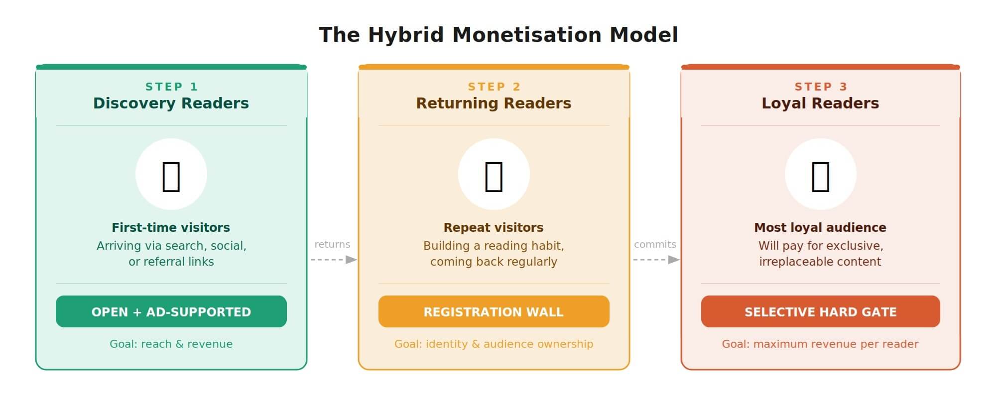 1. Leave discovery open and supported by ads → 2. Add a registration wall to move returning readers into direct and ready to address audiences → 3. Only hard gate the content that your most loyal readers will pay for