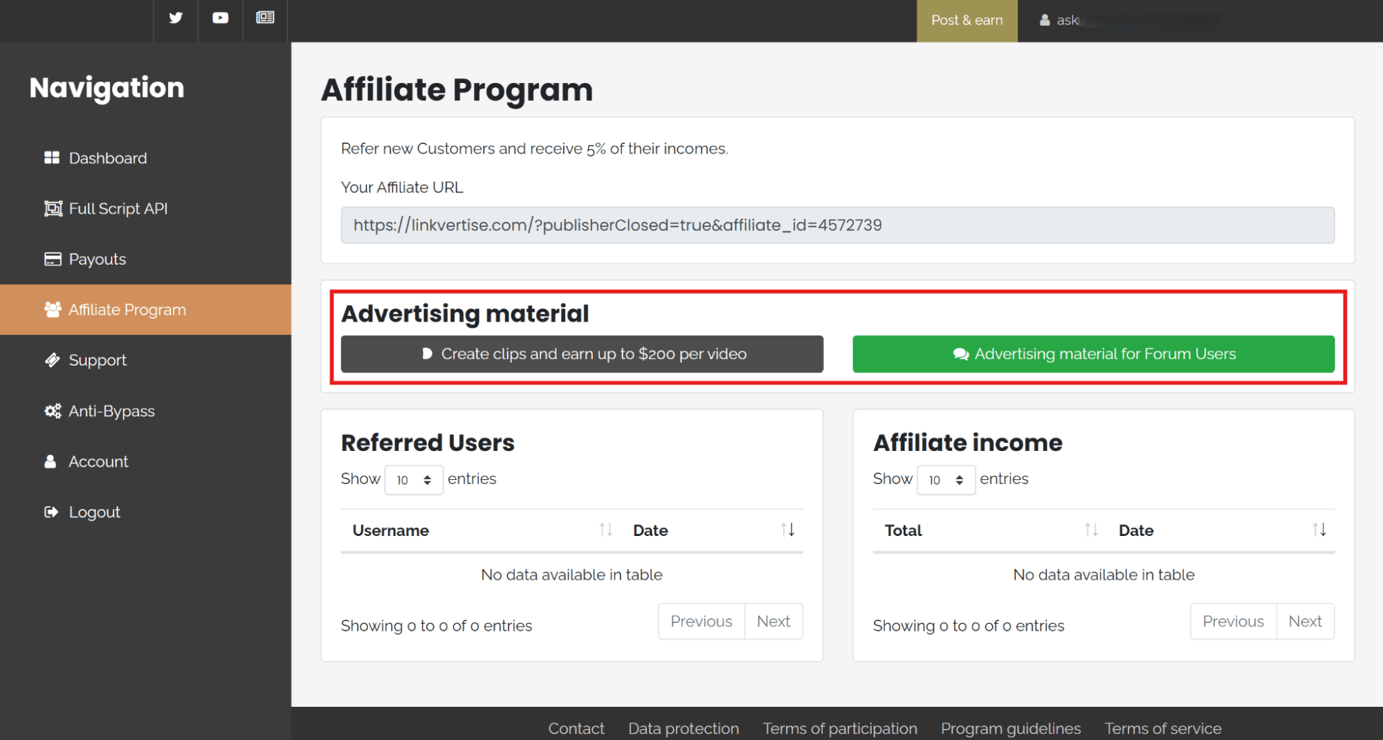 When it comes to the Affiliate side, it’s all tucked away in the publisher dashboard. From there, creators can either share short-form clips on a third-party platform dedicated to this purpose or advertise on forums.