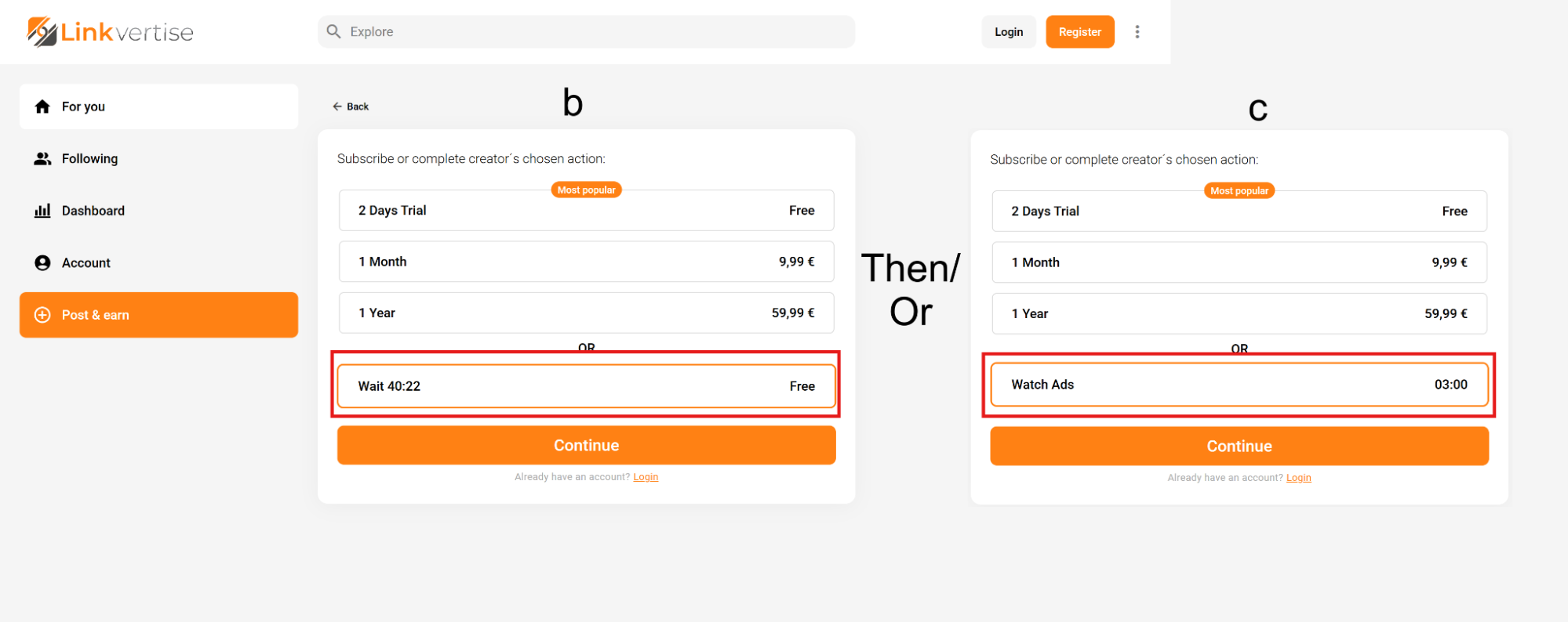 Of course, if you enable your post to be shared on the Linkvertise platform as well, when users navigate the Linkvertise platform, they skip the first two steps. Also, they can get a paid account to skip the timer and the ads. However, from Linkvertise, they can also follow other creators.