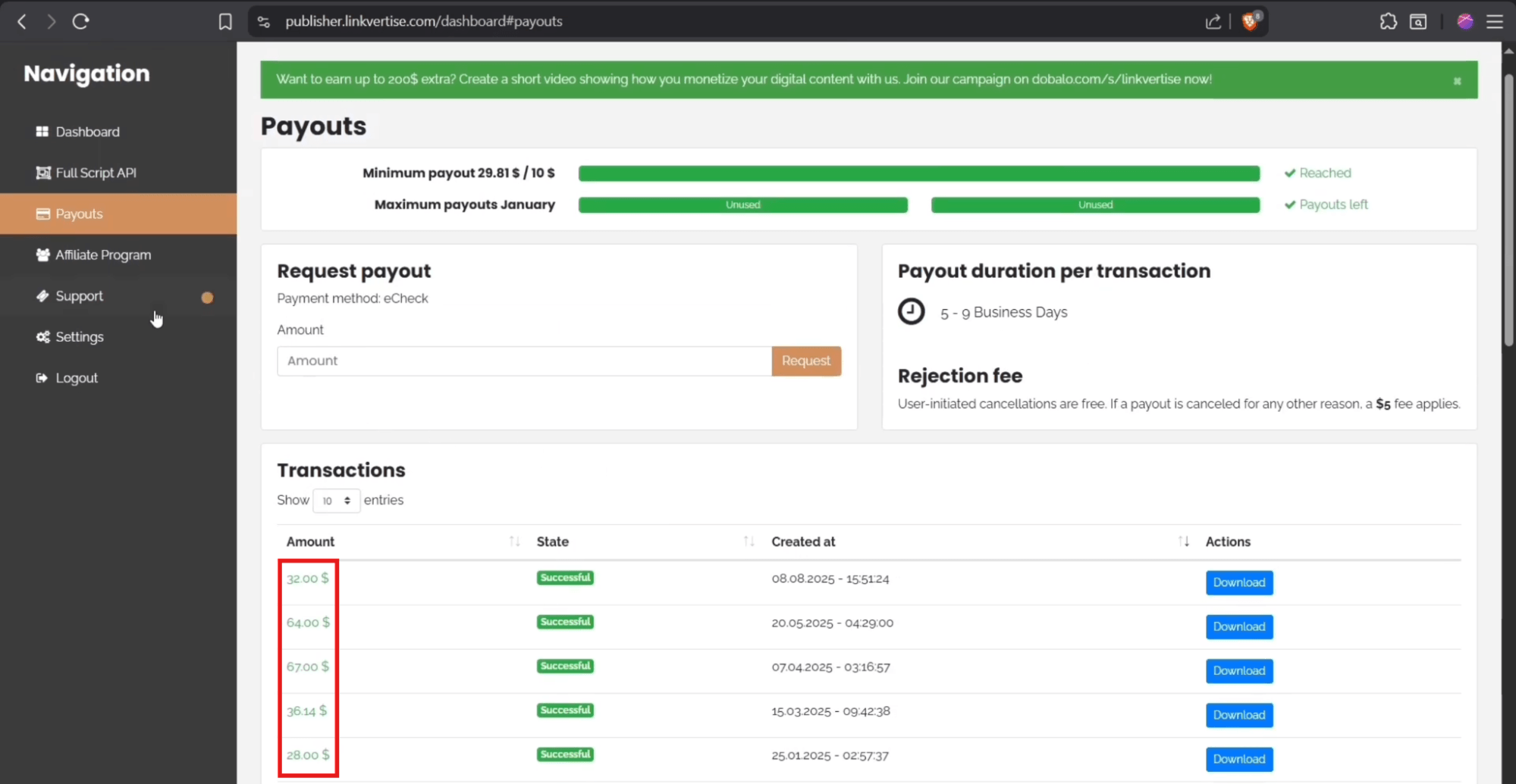 Example of Linkvertise Monthly Payouts; Image Source: YouTube