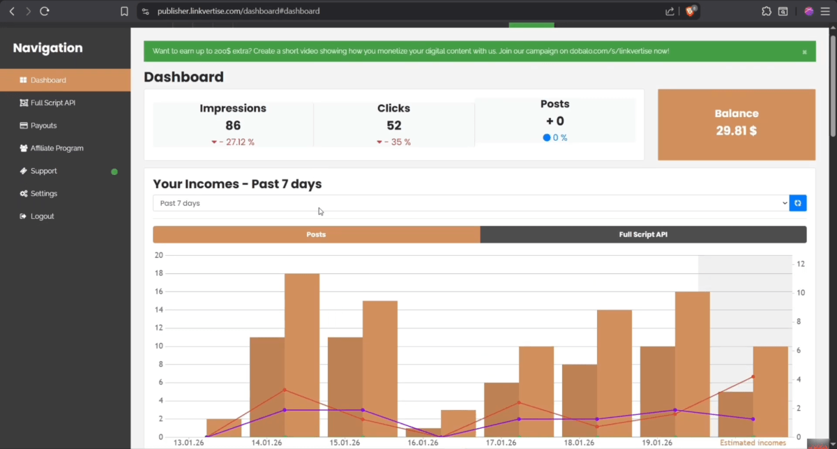 Then, once you pass through the Linkvertise login, you’ll see the dashboard. From here, you can track RPM (Return Per Mile), clicks, impressions, balances, and individual link performance, as you can see in the image above.