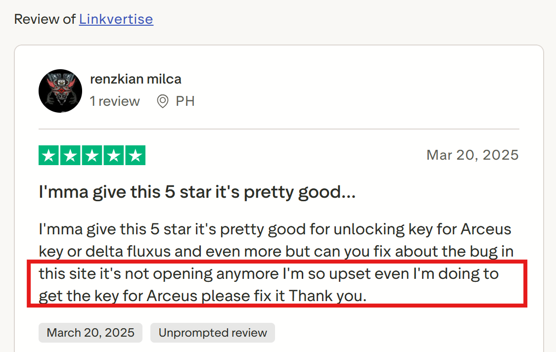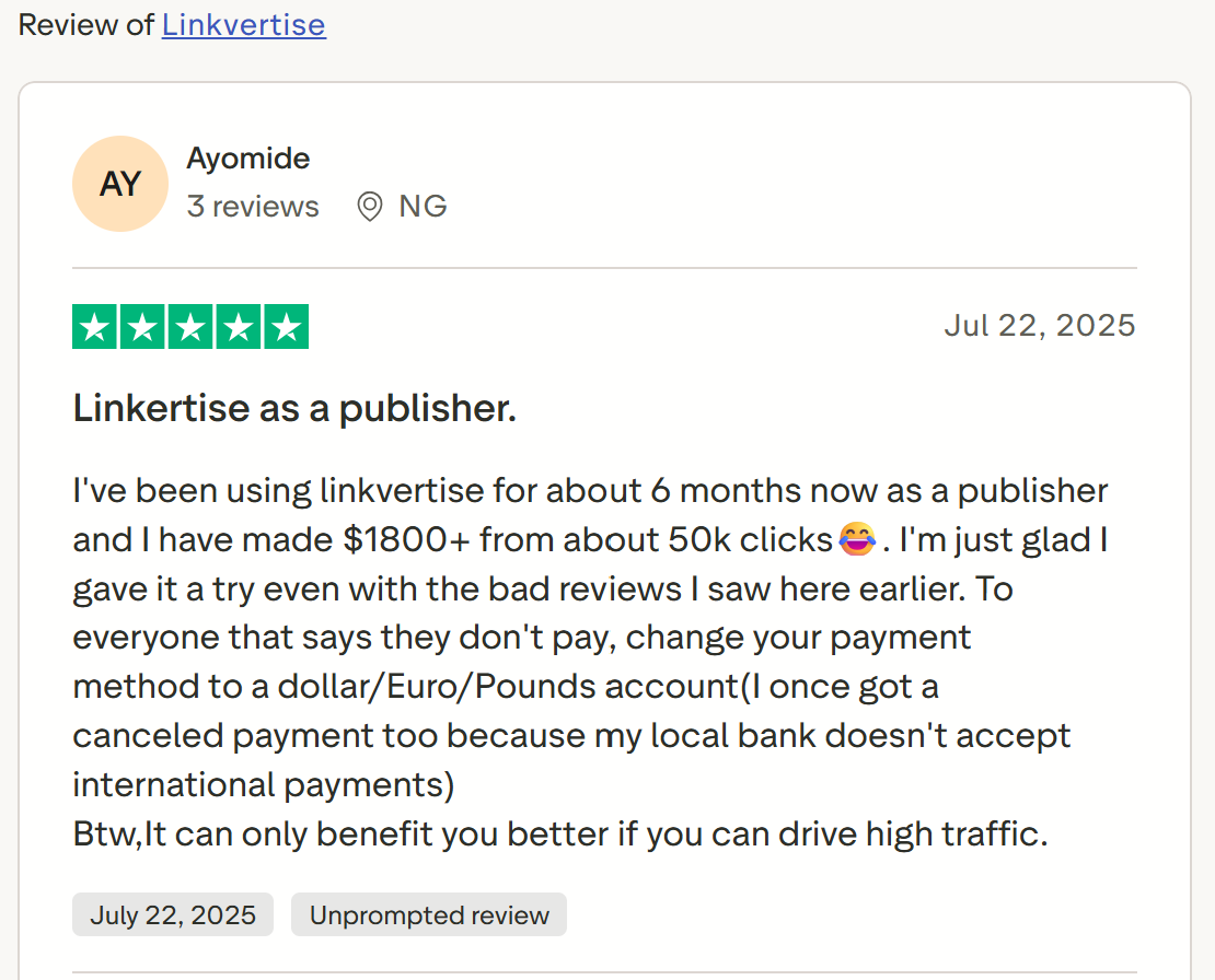 Linkvertise’s Trustpilot score is only 2.4 out of 5 stars, from hundreds of reviews. Upon a closer inspection, we have noticed that several unprompted reviews are coming from verified accounts, praising their efforts and payouts from some of their creators, as this one below: