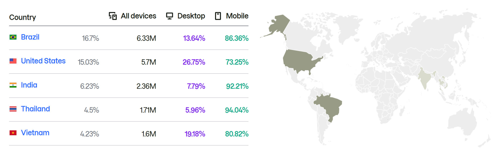 Aside from the publicly available information, there wasn’t anything much on the type of traffic they provide, but we managed to find their main traffic audience by GEOs: