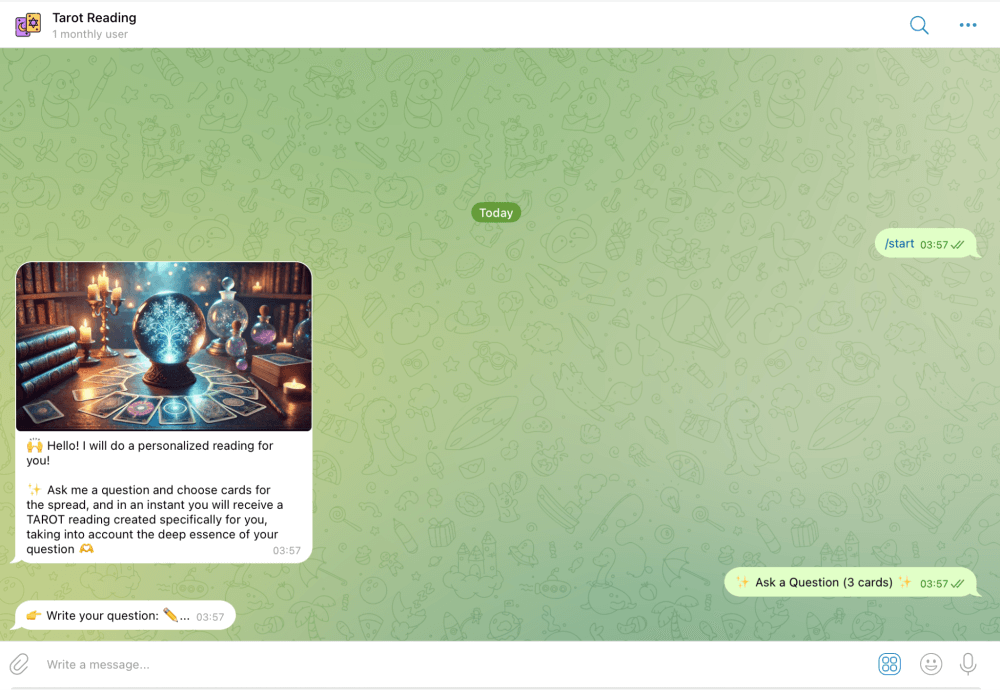 Source: Tarot reading bot Description: The AI-based bot answers random user questions, imitating a Tarot reading