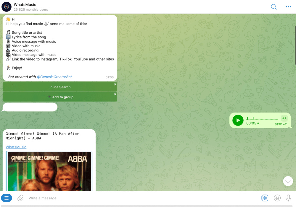 In this case, you simply send the bot an audio message with the music or type a piece of the lyrics, and this Shazam-like bot gives you the track name. So you don’t need to close Telegram, Google it, or use Shazam; you can get the result right inside the bot in just a couple of clicks.